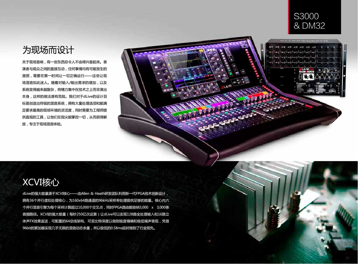 dLive的強大能量源于XCVI核心——由Allen & Heath研發(fā)團隊利用新一代FPGA技術(shù)創(chuàng)新設(shè)計,擁有36個并行虛擬處理核心,為160x64路通道的96kHz采樣率處理提供足夠的能量。核心內(nèi)六個并行混音引擎為每個采樣計算超過10,000個交叉點,同時FPGA路由能容納3,000 x 3,000條音頻路徑。XCVI的強大能量(每秒250億次運算)讓dLive可以實現(xiàn)128路全處理輸入和16組立體聲FX效果返送,可配置的64總線架構(gòu)、可變比特深度以做到極度精確和極低噪聲表現(xiàn),憑借96bit的累加器實現(xiàn)幾乎無限的混音動態(tài)余量,并以極低的0.6ms延時做到了行業(yè)領(lǐng)先。