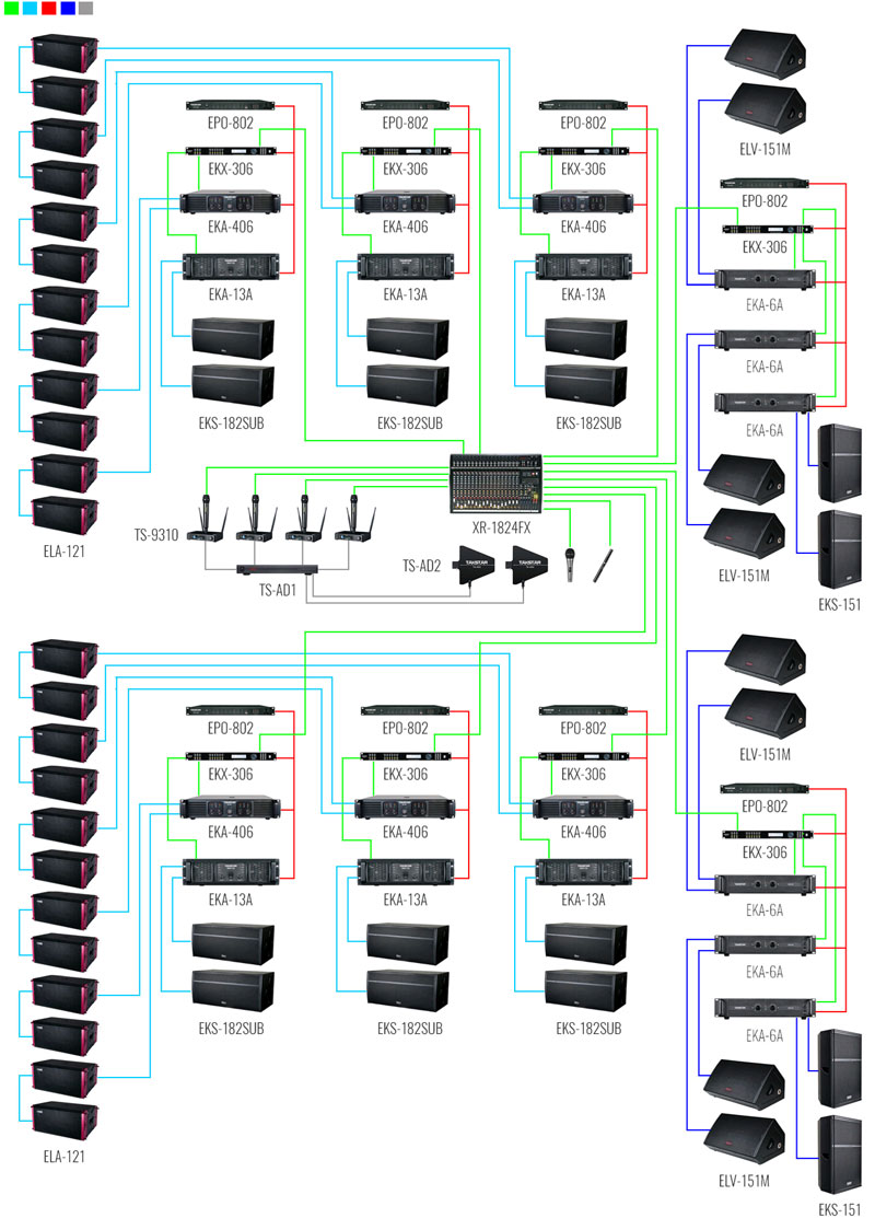 我司為大型戶外演出提供如下音響系統(tǒng)擴(kuò)聲解決方案,本套擴(kuò)聲方案選用了高度智能化、集成化的產(chǎn)品,建立了開(kāi)放式的架構(gòu)系統(tǒng),在實(shí)際應(yīng)用上既滿足了系統(tǒng)管理維護(hù)使用的便捷性,又保持了系統(tǒng)能夠較長(zhǎng)時(shí)間工作的穩(wěn)定性。在現(xiàn)場(chǎng)舞臺(tái)產(chǎn)品搭配上發(fā)言單元選用得勝高品質(zhì)真分集無(wú)線話筒TS-9310搭配TS-AD系列天線放大系統(tǒng),遠(yuǎn)距離無(wú)損耗拾取人聲;擴(kuò)聲單元配備了得勝ELA線性陣列音箱以及ELV系列,EKS系列全頻、超低音、返聽(tīng)揚(yáng)聲器,加上XR-1824多通道調(diào)音臺(tái),外接EKX-306高精度處理器、EQ-3102處理器等周邊設(shè)備,組成了一整套能夠最大程度上提升現(xiàn)場(chǎng)演出震撼感與舞臺(tái)魅力的大型戶外擴(kuò)聲系統(tǒng)。